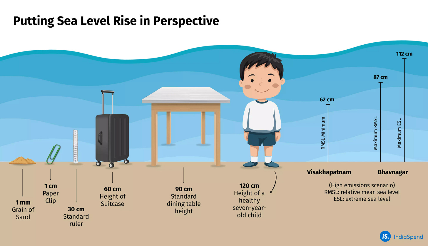 Future projections of relative mean sea level indicate a rise all along the Indian coasts ranging from 62 cm in Visakhapatnam to 87 cm in Gujarat’s Bhavnagar under a high emissions scenario.