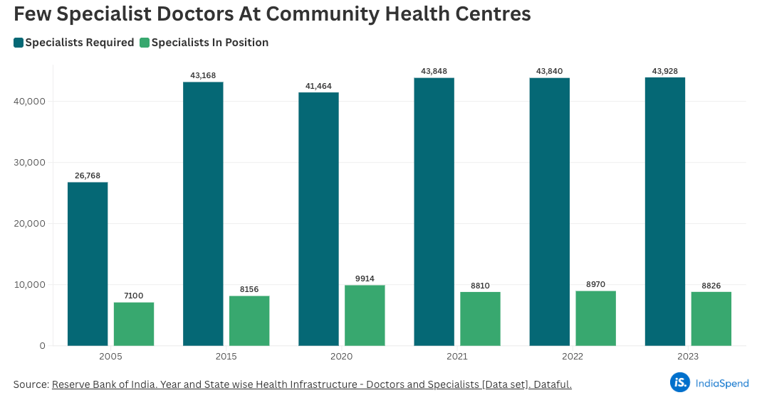 Community health centres face an 80% shortfall in specialists. Radiographer shortages at health centres increased from 35% in 2005 to 58% by 2022-23. What this means is that millions of Indians end up having to approach tertiary centres even for a simple X-ray, often losing a day’s wages and spending money and to get there.