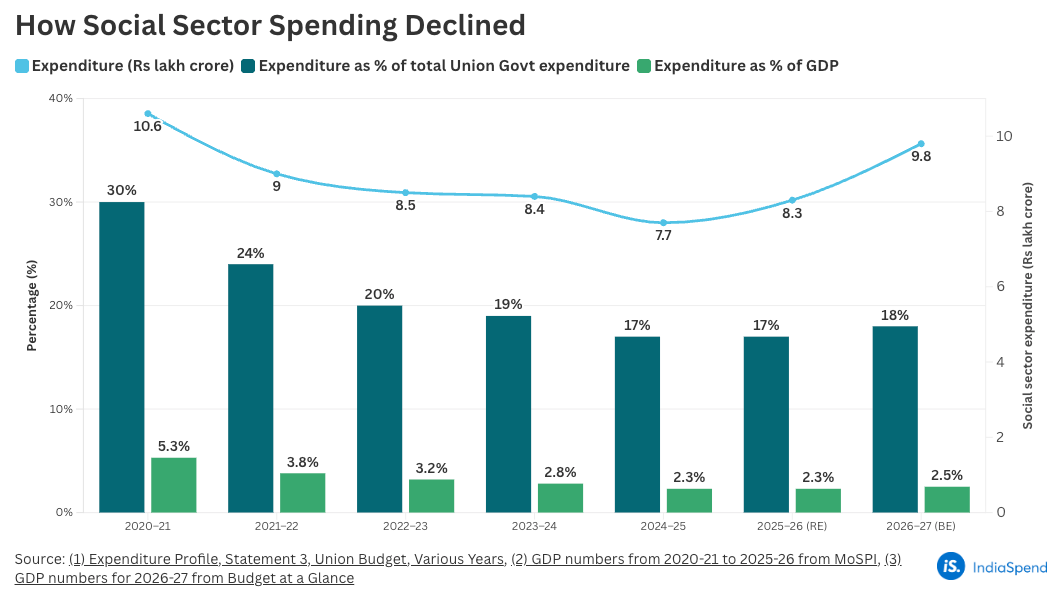India’s social sector budget as a share of GDP is now at its second-lowest point in over a decade—lower even than 2014-15, when the Modi government presented its first budget. Even so, eight key ministries saw parts of their budgets unspent in 2024-25.