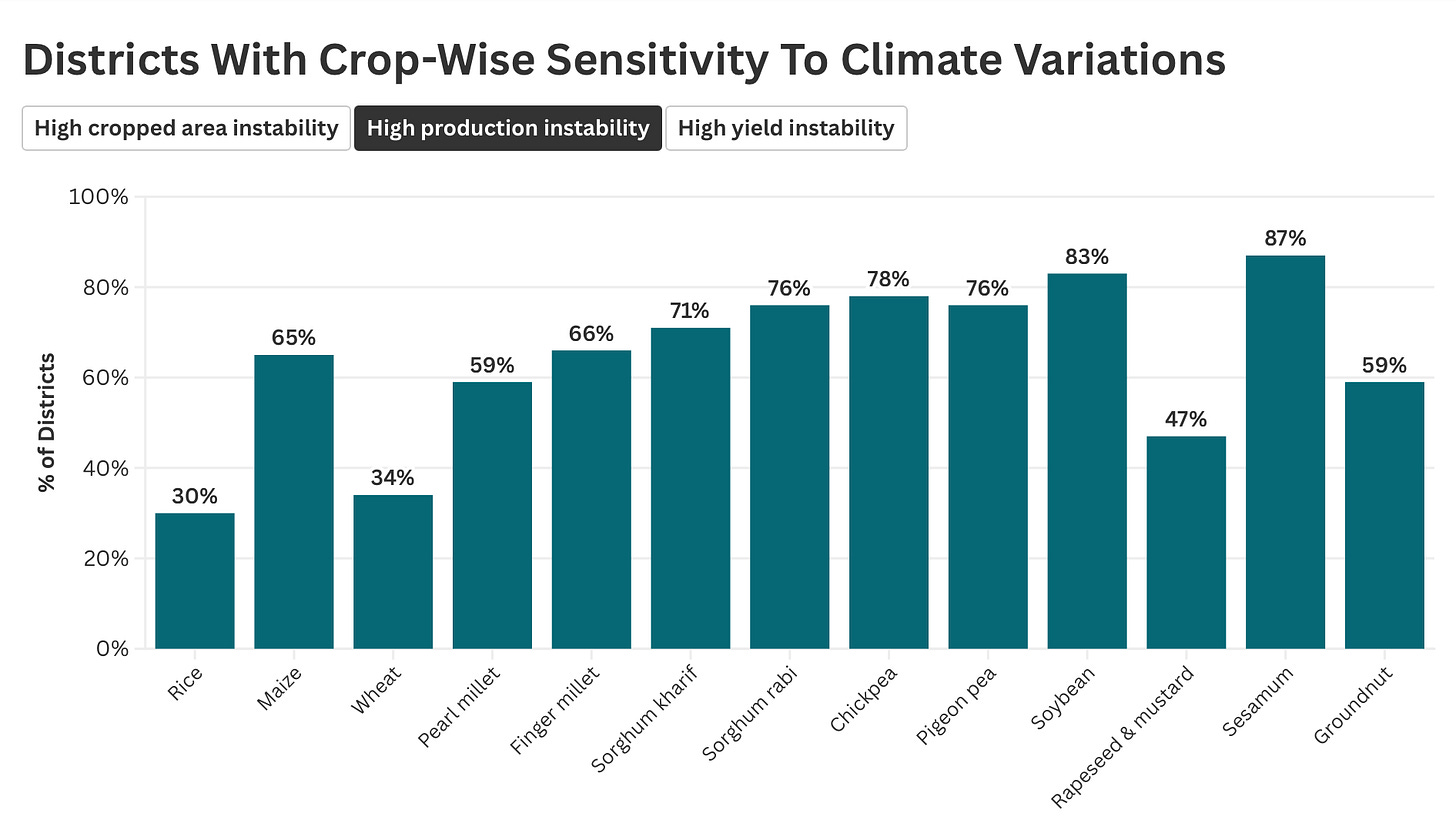 India hit record paddy production in 2024-25, but a survey of 6,615 marginal farmers found that half the paddy farmers lost more than 50% of their crop to extreme weather—every year for five straight years. And 65-87% of districts growing nutritious crops—millets, pulses, vegetables, oilseeds—show high production instability due to climate change.