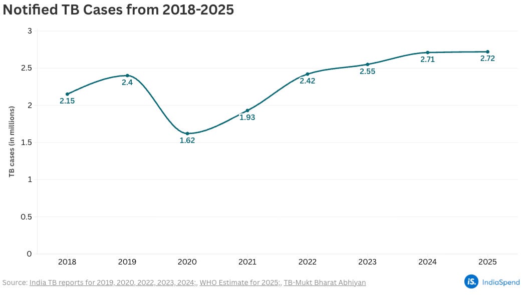 India’s TB elimination target for 2025 was 44 cases per 100,000 population. But that year, India had 185 cases per 100,000, more than four times the target.
