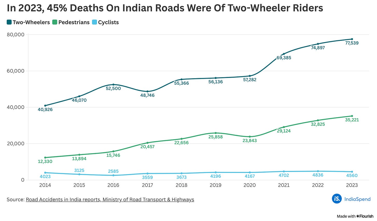 But even with the limitations, data for the year 2023 released recently show a worrying trend: Indian roads are increasingly becoming more dangerous for its most vulnerable users.